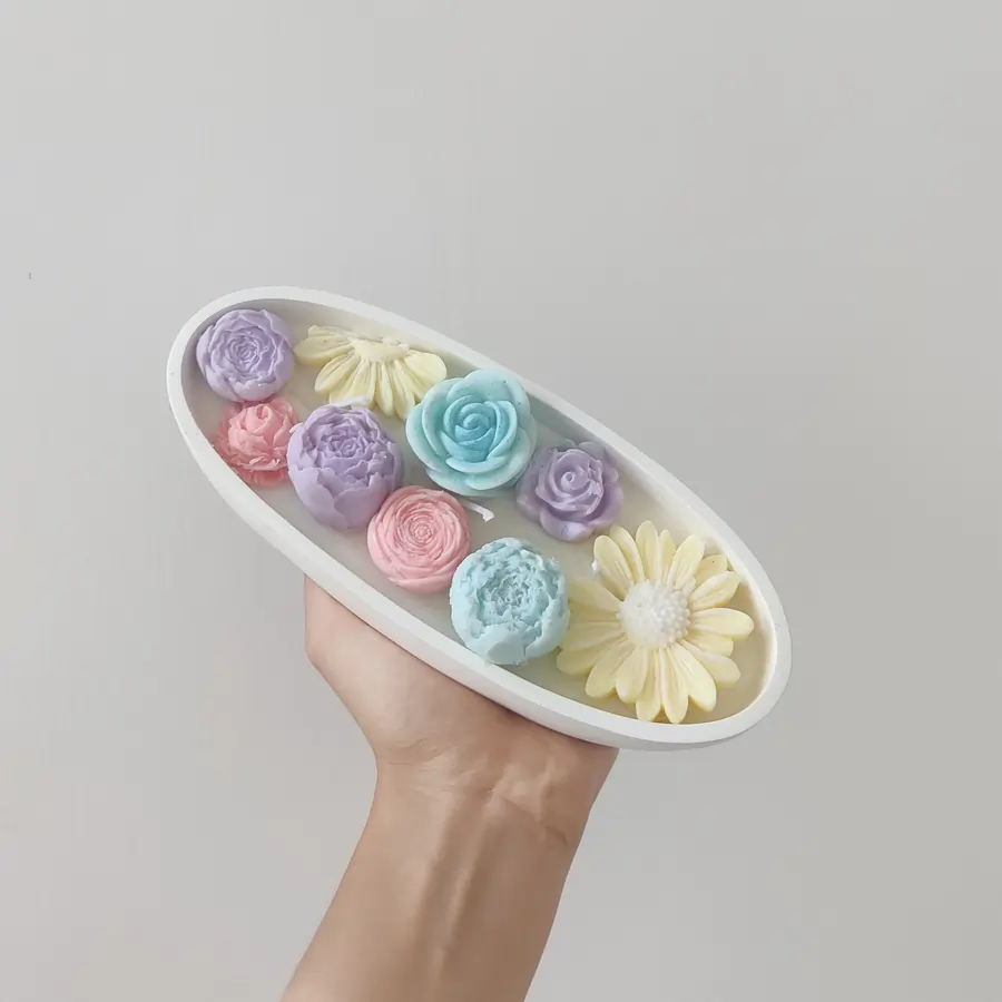 Notre Grande Bougie Garden est à base de cire de soja naturelle. Elle se compose du récipient à base de ciment plein de cire do soja sur laquelle on a 9 fleurs à base de cire de soja également.