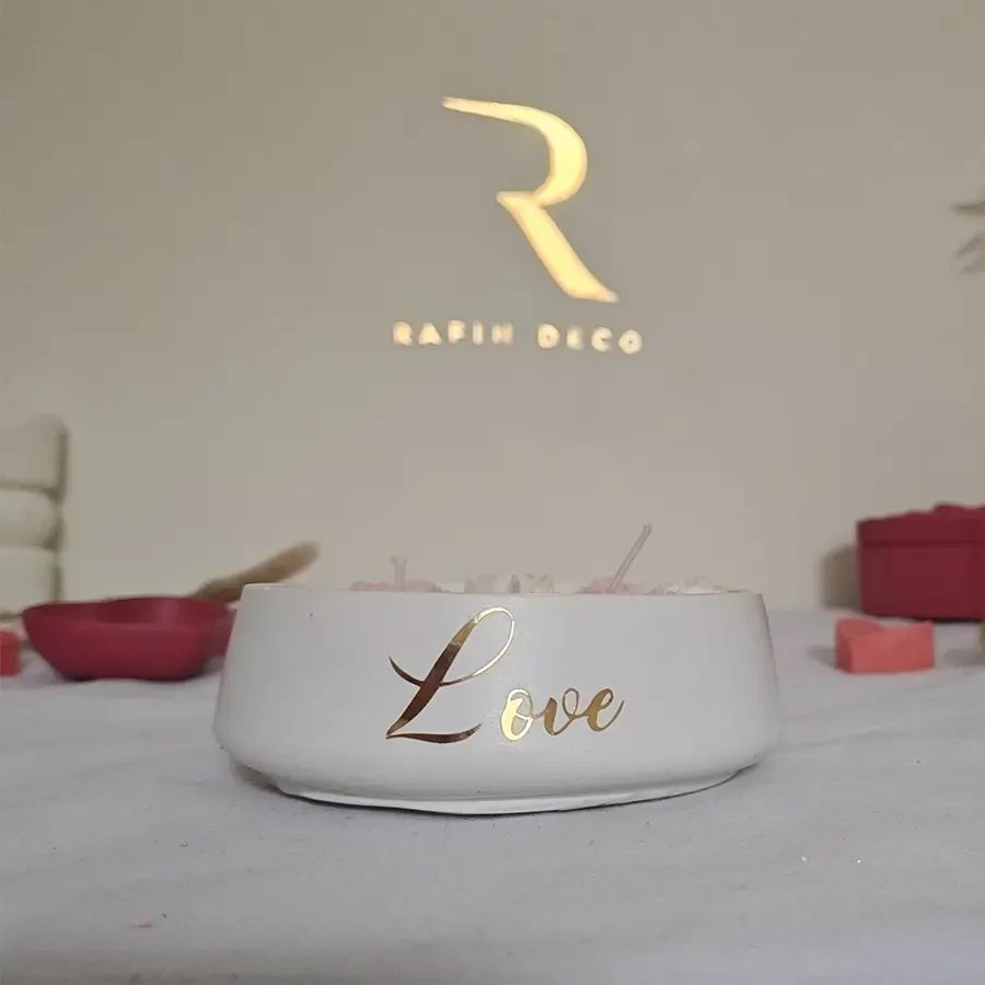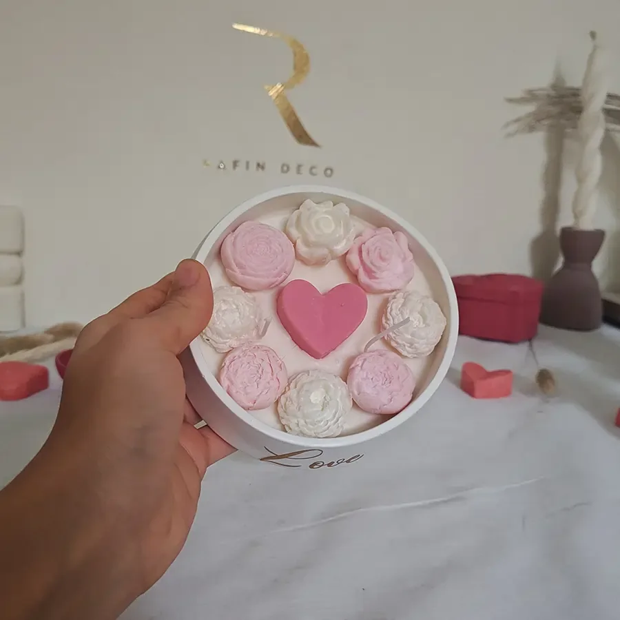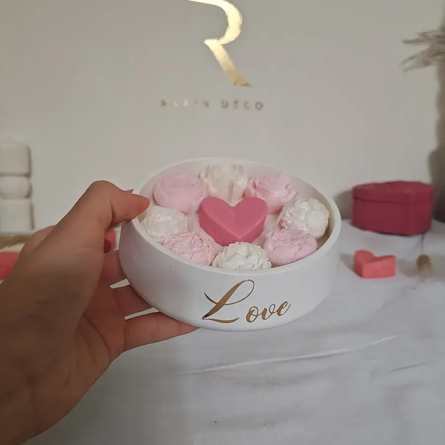 Notre Bougie Beloved est à base de cire de soja naturelle. Elle se compose du récipient à base de ciment plein de cire do soja sur laquelle on a un coeurs et fleurs à base de cire do soja aussi.