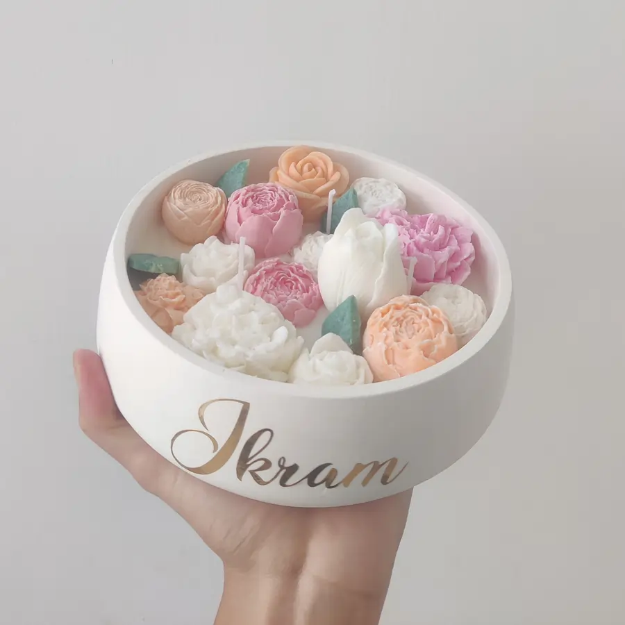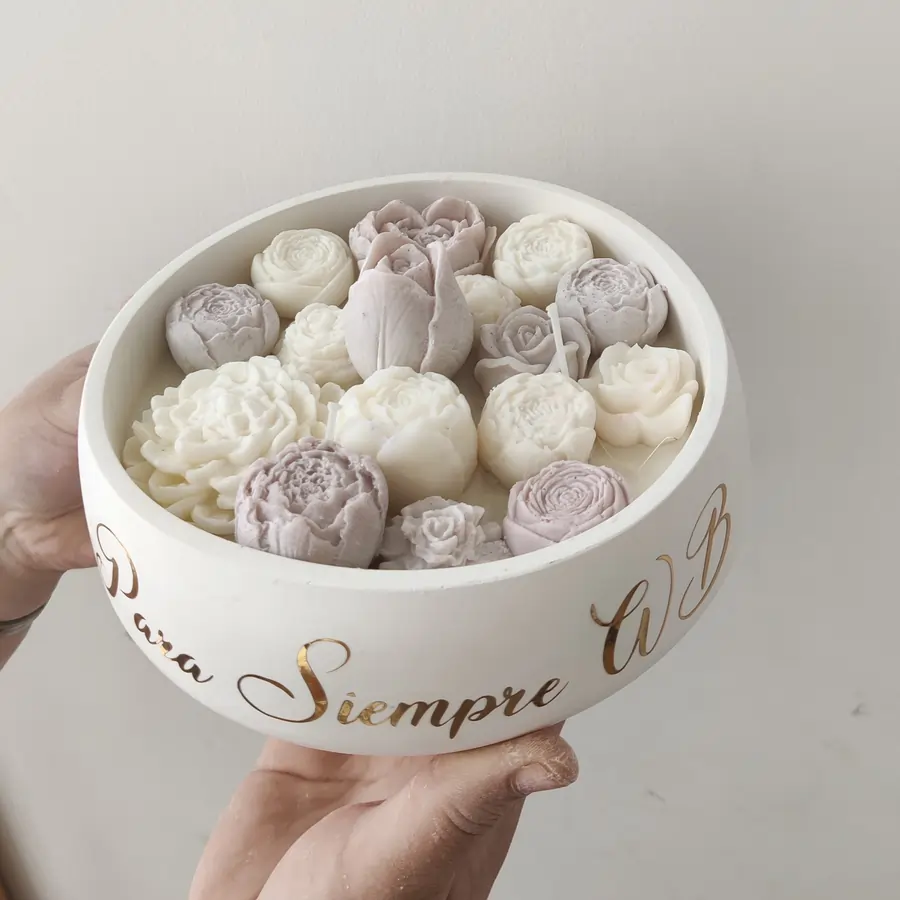 Notre Grande Bougie Garden est à base de cire de soja naturelle. Elle se compose du récipient à base de ciment plein de cire do soja sur laquelle on a 14 fleurs et 6 pétales à base de cire do soja également.