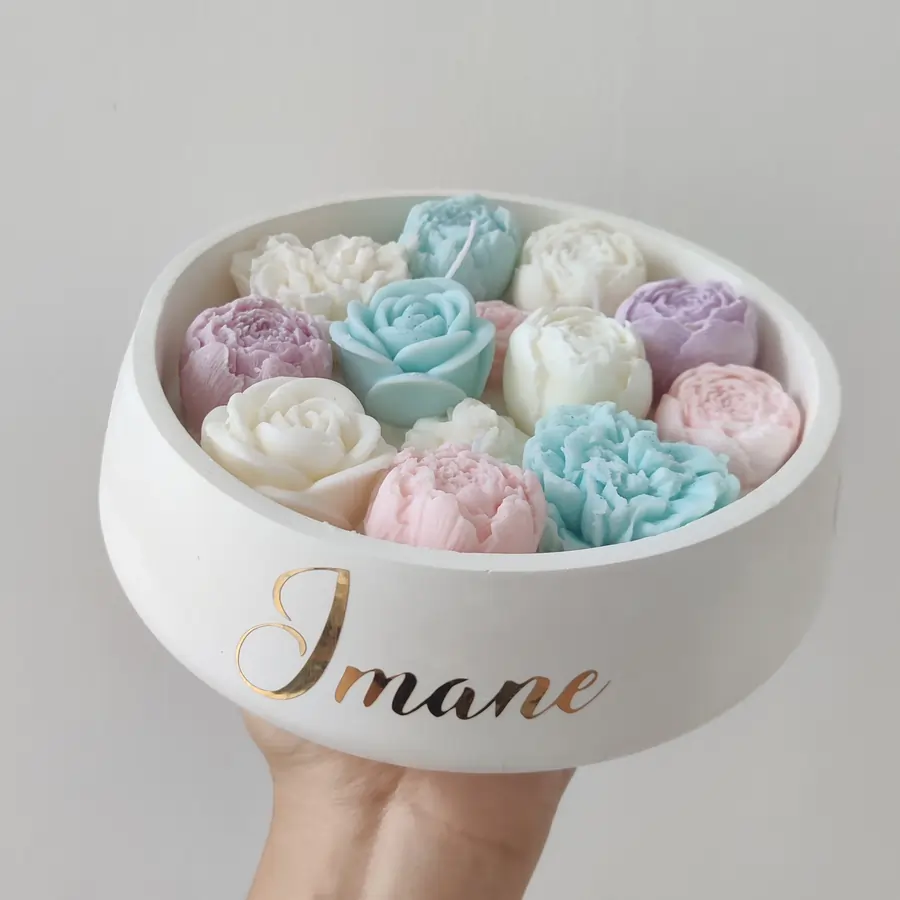 Notre Grande Bougie Love est à base de cire de soja naturelle. Elle se compose du récipient à base de ciment plein de cire do soja sur laquelle on a 12 fleurs à base de cire do soja aussi, en blanc et violet.