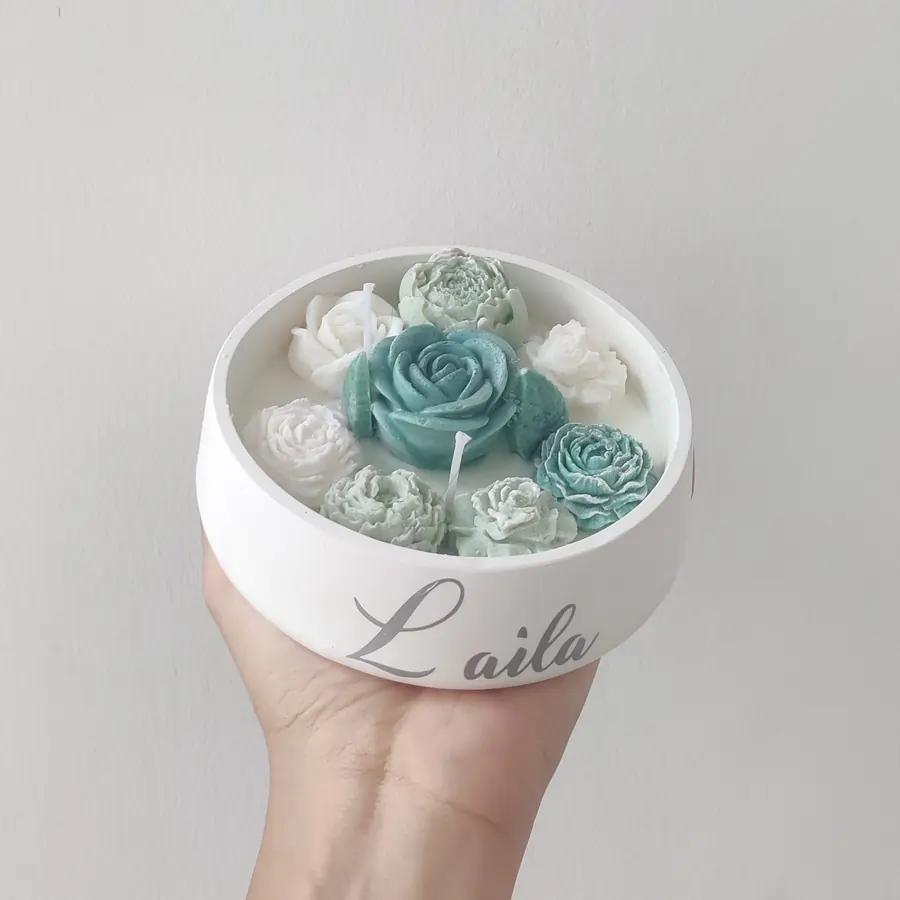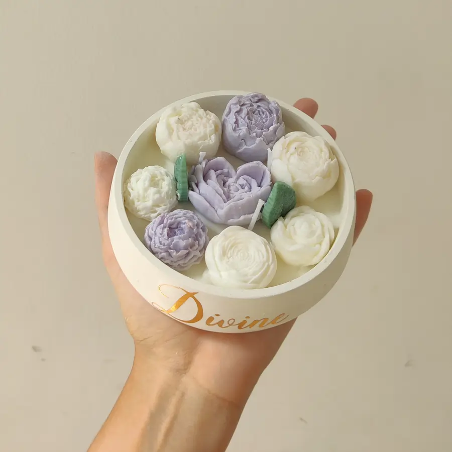Notre Grande Bougie Garden est à base de cire de soja naturelle. Elle se compose du récipient à base de ciment plein de cire do soja sur laquelle on a 8 fleurs et 2 pétales à base de cire do soja également.